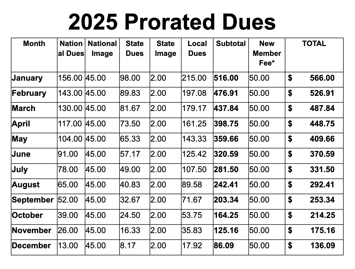 * Your 2025 dues total includes a $45 mandatory assessment by the National Association of REALTORS® of all REALTOR®, REALTOR® Associate and Institute Affiliate Members to fund a nationwide public awareness campaign that includes TV network and cable ads highlighting the value a REALTOR® brings to a transaction and stressing the importance of using a REALTOR®.