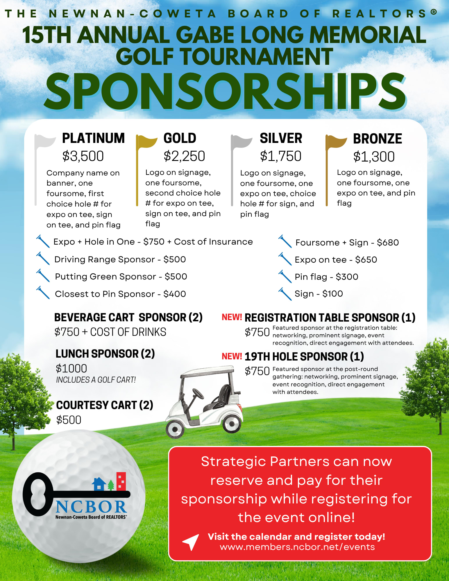 🎟️ Sponsorships Available — Platinum to Bronze levels, plus new specialty sponsorships like Registration Table Sponsor, 19th Hole Sponsor, and more!