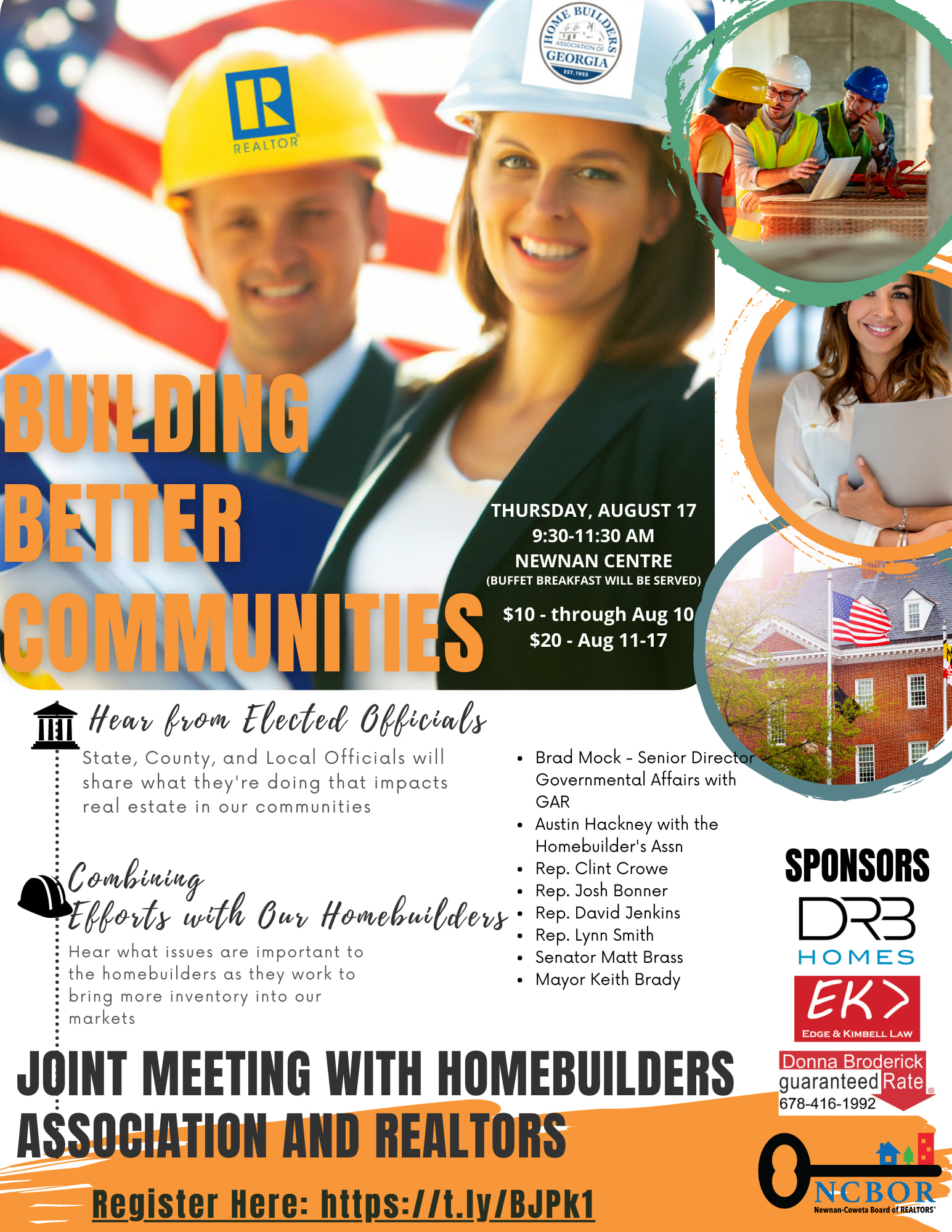 State, County, and Local Officials will share what they're doing that impacts real estate in our communities. Hear what issues are important to the homebuilders as they work to bring more inventory into our markets
