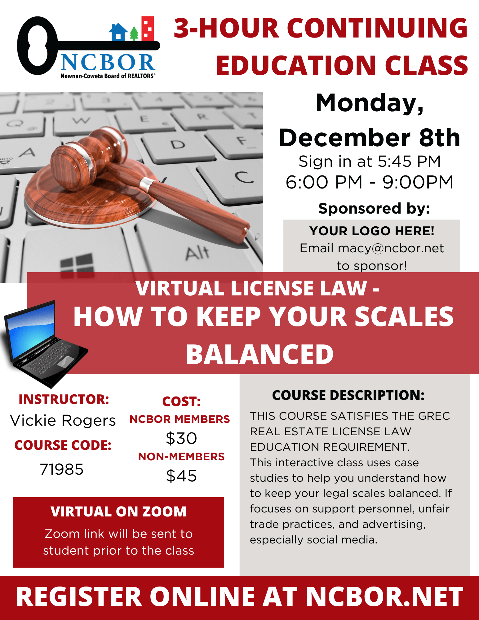 Instructor: Vickie Rogers. "THIS COURSE SATISFIES THE GREC REAL ESTATE LICENSE LAW EDUCATION REQUIREMENT.