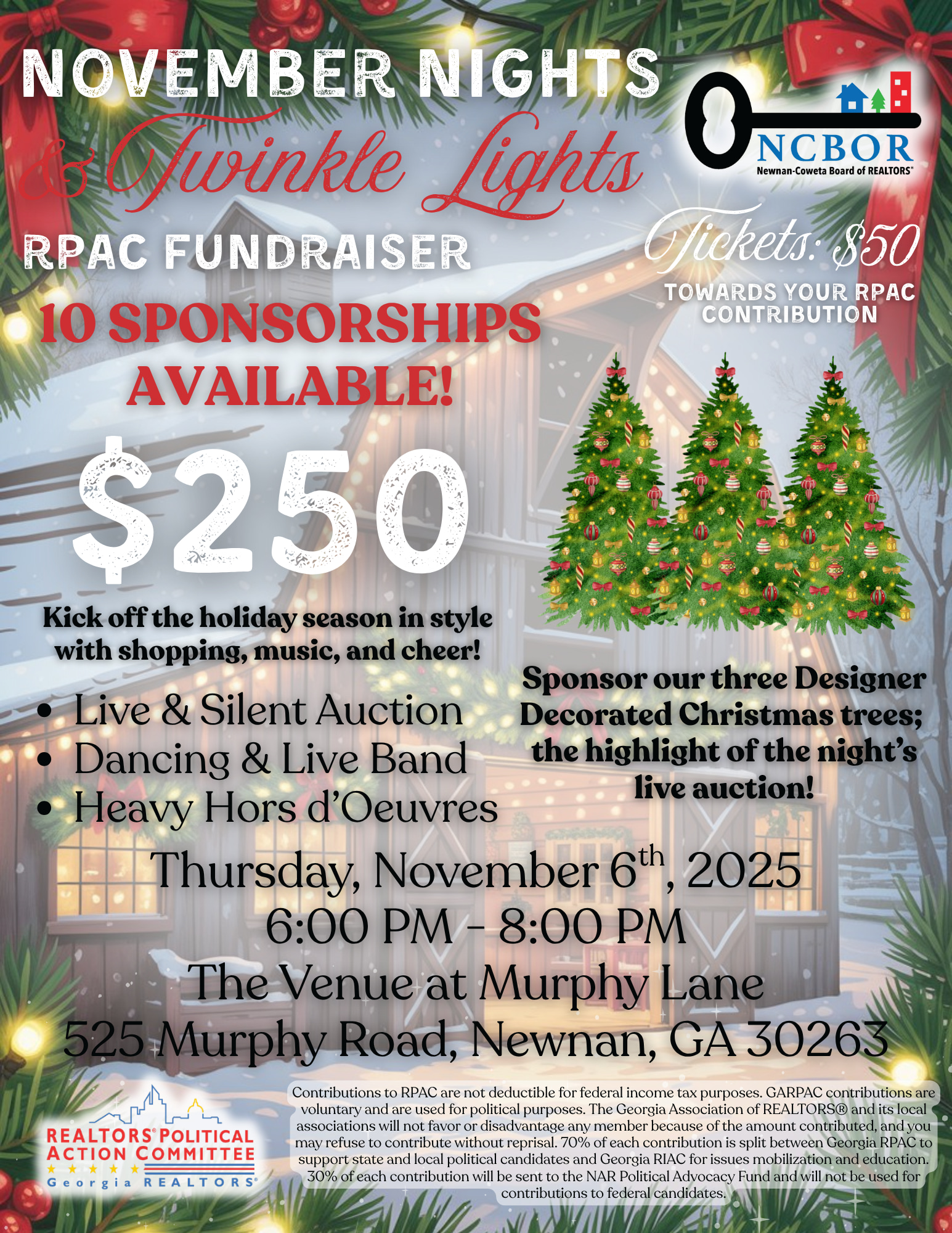 November Nights & Twinkle Lights is your chance to kick off the holiday season with laughter, lights, and a little REALTOR® magic. Enjoy yummy bites, live music, festive auctions, and twinkling décor that will have you feeling merry in no time!